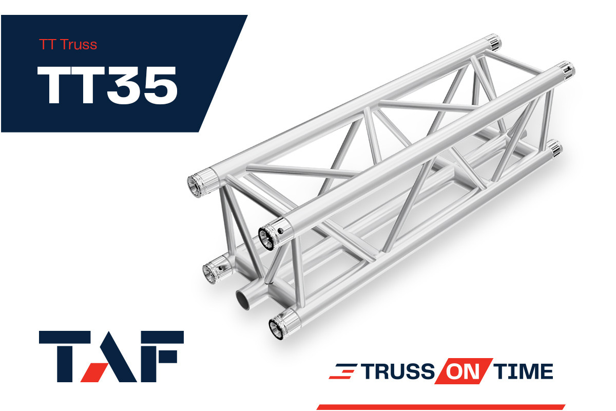 TAF’s TT35 medium-duty truss line further extends the practicality of your truss structures with the addition of a strong and rigid central rigging tube that allows for the quick and easy hanging of LED panels, screens or other fixtures.